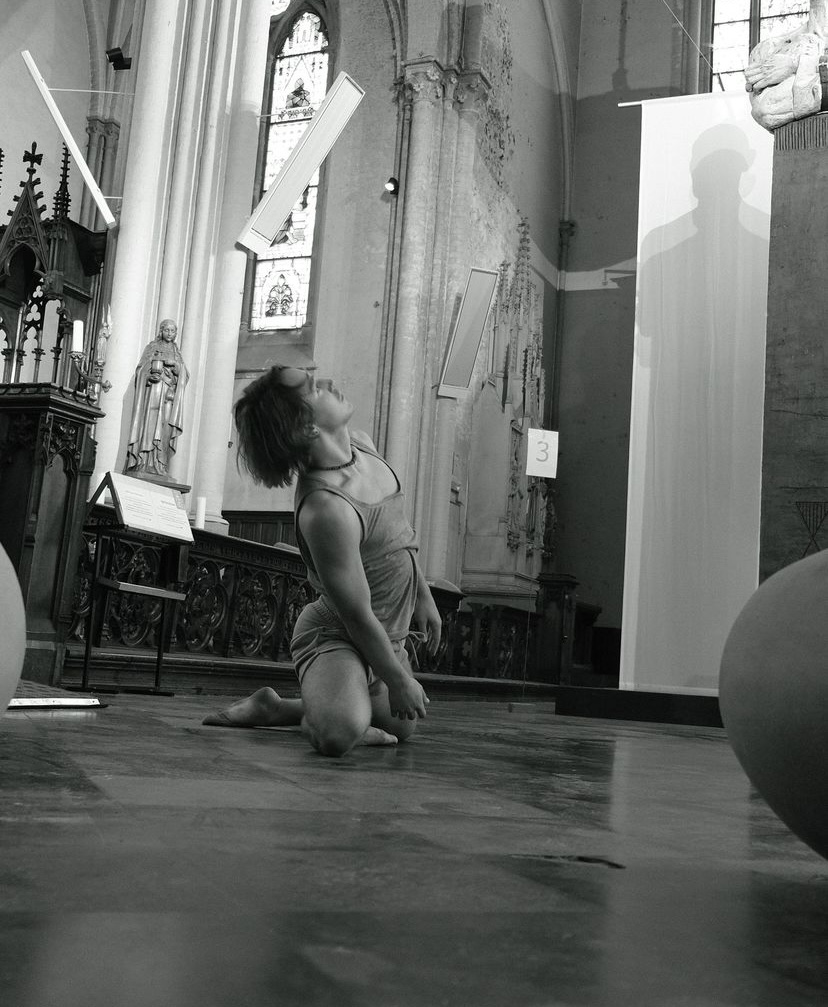 Ik startte mijn opwarming met een korte kennismaking met een Tantalusbeeld, een beeld dat YOT voor de Magdalenakerk heeft verworven. Tantalus is metershoog, een buste die in de hoogte is getild door harde donkere steen. Boven zijn hoofd hangt een grote steen waarop woorden staan geschreven.  Wat hangt er toch boven je hoofd, Tantalus? Wat maakt je zo zwaar, zo onbeweeglijk? Het beeld heeft een sterke mannelijke uitstraling. Het lichaam dat ik in mijn dans verwelkom, is dat van een vrouw, Maria Magdalena. Hoe gaan deze twee figuren in dialoog, een gesprek gevoerd doorheen lichaam en ruimte. Beide archetypes vinden elkaar op de grond, en net zoals Atlas gaan ze gebukt onder de last van de wereld. De massieve aarde trekt me naar haar toe. De dans die zich opdringt, is langzaam. Ik kronkel over de vloer en ontdek de dimensies van het leven aan de oppervlakte. Net als wortels verspreid ik me terwijl mijn lichaam zich ontvouwt. Ik voel me niet neergeslagen, eerder omsloten door horizontale onzichtbare membranen die zich om de aarde wikkelen. Ik nestel me van de ene positie in de andere. Soms verschuift mijn aandacht want de lens van de camera bekijkt me. Magdalena wordt begluurd, maar ook dit is een onderdeel van haar apostolaat. Tantalus, Magdalena, wie kijkt er nog naar ons en wat kunnen we voor hen betekenen?