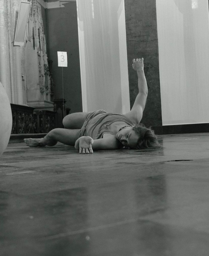 I started my warm-up with a brief encounter with the Tantalus statue, a statue YOT acquired for the Magdalena Church. Tantalus is several meters high, a dark bust erected. Above his head hangs a large stone on which words are written. What’s hanging over your head, Tantalus? What makes your body so heavy, so immobile? The statue has a strong masculine appearance. However, I embrace the female body of Mary Magdalena in my dance. How do these two figures interlock, a conversation between ancient interlocutors conducted through body and space. Both archetypes find one another on the ground, and like Atlas, they are weighed down by the burden of the world. The solid earth draws me to her. Slow is the dance that imposes itself upon me. I squirm on the floor, discovering the dimensions of life on the surface. Like roots, I spread as my body unfolds. I don’t feel knocked down, rather enclosed by horizontal invisible membranes that wrap around the earth. I settle from one position to another. Sometimes my attention shifts because the lens of the camera looks at me. Magdalena is being watched, but this too is part of her apostolate. Tantalus, Magdalena, who is still watching us? What does it mean?