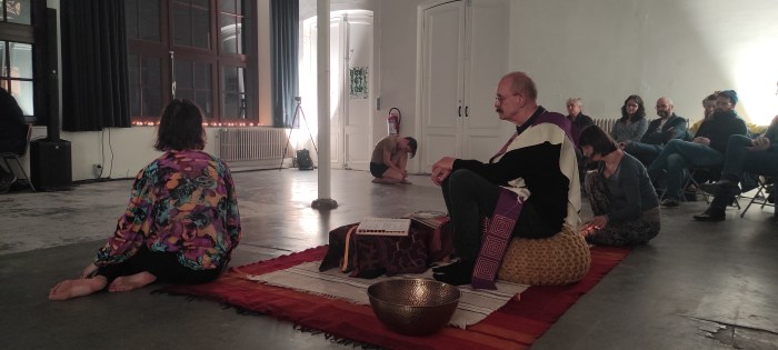 Nadien zetten we ons gesprek verder met ons vier. Ik vroeg me welke rol Maria Magdalena speelde tijdens de herinrichting van de klassieke kerk. Tom duidde deze vraag binnen zijn onderzoek naar de sacrale en “genereuze ruimte”. In deze ruimte kunnen mensen samenkomen om te zoeken. Wat Tom sacraal noemt, gaat terug op een wezenlijke verbondenheid. Net als Magdalena helpt de genereuze ruimte een plaats van gave te openen die ontstaat vanuit vertrouwen en veiligheid. Ze streeft naar verwevenheid en maakt plaats voor beweging met aandacht voor raakpunten en verschillen. Ze is als kledij die lichamen omsluit. Het is een veilige plaats die uitnodigt om te ademen en om op natuurlijke wijze naar buiten te treden (en steeds terug – zonder kleerscheuren – inwaarts te keren). In de eerste plaats moet de “Magdalenadans” dus een ruimte genereren waartoe we uitgenodigd worden en die ons aanzet om in- en uitwaarts te keren op het ritme van onze ademhaling. De dans kan ons doen glijden tussen de poreuze omwallingen die ons menselijk bestaan in stand houden.