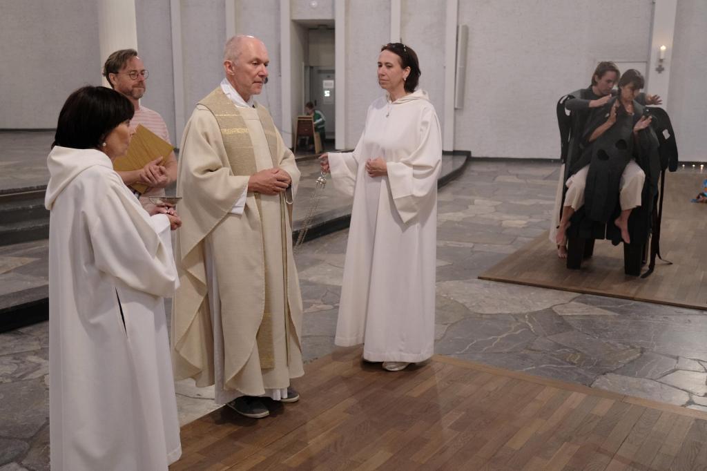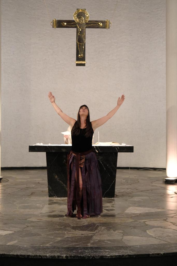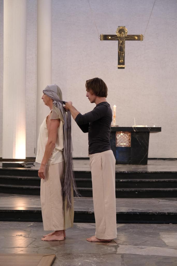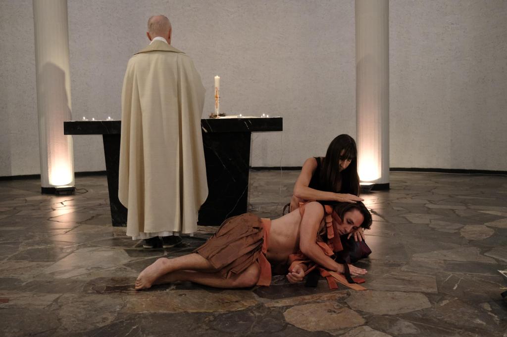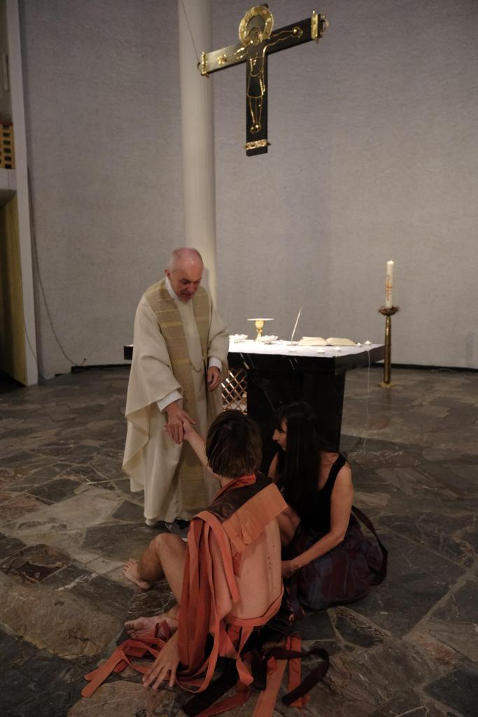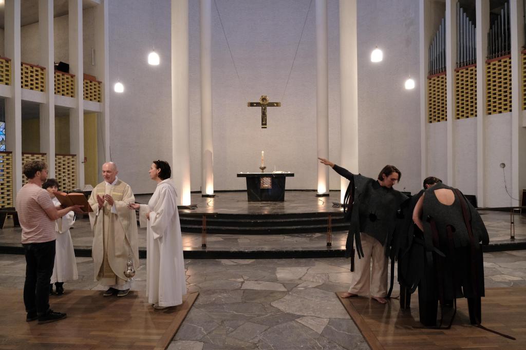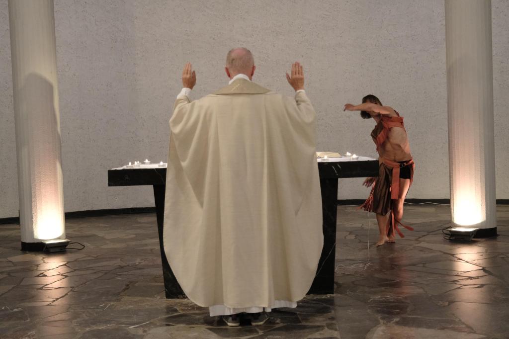 performance art. On two Sunday celebrations and two evening performances, we want to explore the implications of this equation with special attention to the notion of “participation”, a term that rose in popularity in both liturgical and artistic discourse over the past decades. Respecting the eucharistic form and its procedures, we will implement theatrical and choreographic interventions in collaboration with the church community and the celebrating priest to study the audience response and improve the performative and sacramental value of the event.