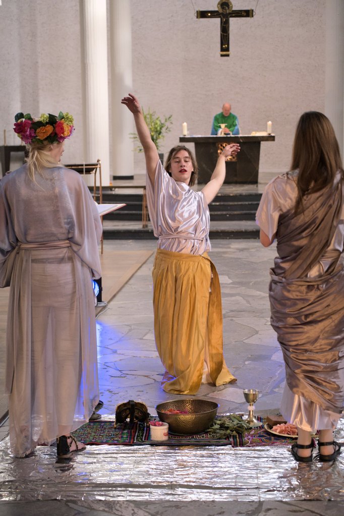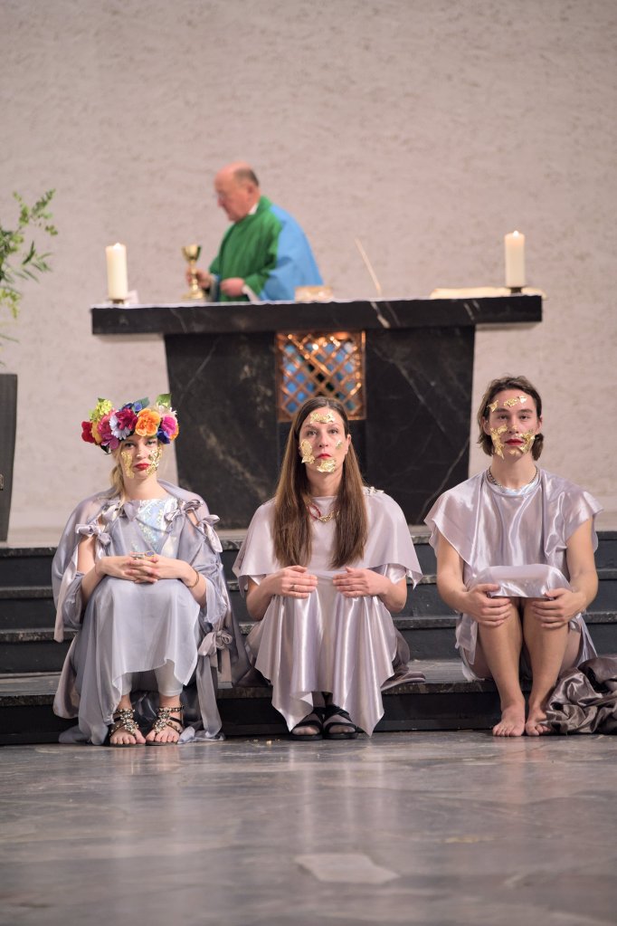 Who is this mysterious Sophia, this feminine Wisdom? Since time immemorial, she lingered, wandering the earth, barely remembered by human beings. Driven by their will to rationalize and to dominate creation, they exchanged her love for power and intellect. This liturgical performance initiates a quest, a hero’s journey, to re(dis)cover Sophia. The dance unfolds during the Service of the Word and explores a ritualistic and theatrical landscape to uncover hidden knowledge, stored in our bones and veins. The climatic encounter between masculine Logos and feminine Sophia transforms the Sermon into a moment of mystical union; the Eucharistic Sacrifice into a journey home.